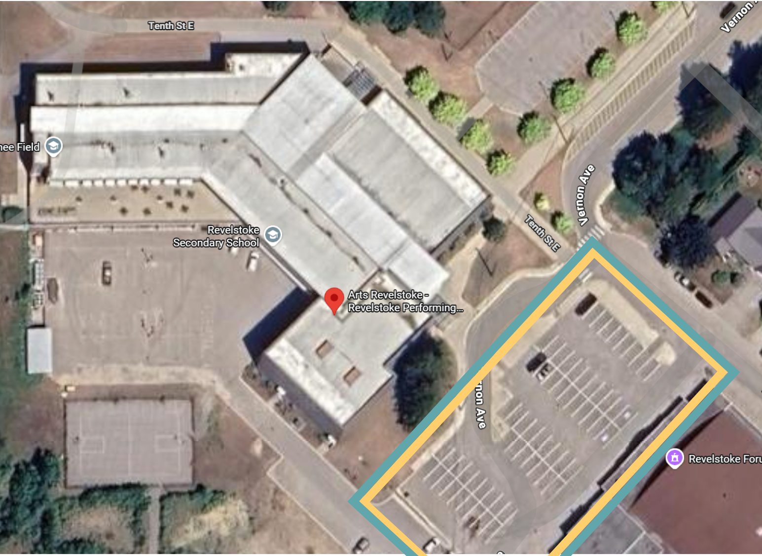 Parking will be within the yellow+blue square at the Revelstoke Forum. We recommend you ride bikes!
